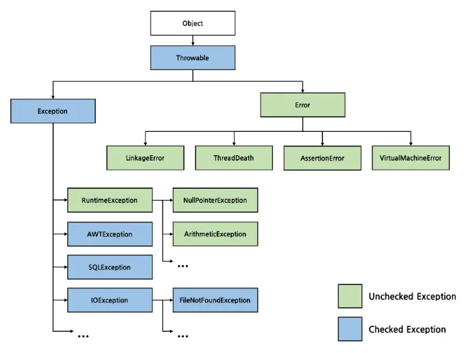 명시적 예외 처리 여부에 따라서 Checked Exception과 Unchecked Exception으로 구분한다.